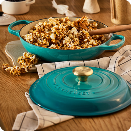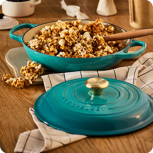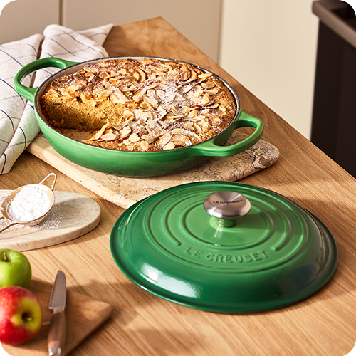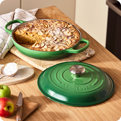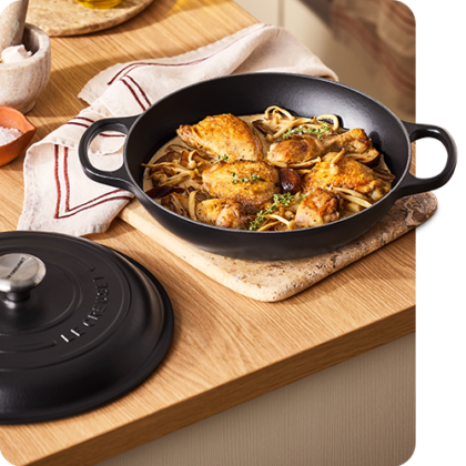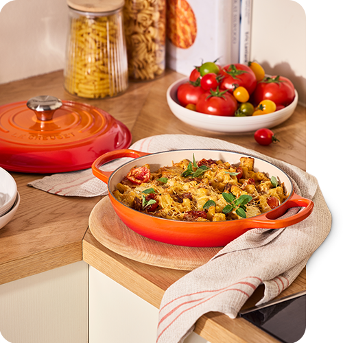 Zoals je van Le Creuset mag verwachten, speelt het materiaal hierin een grote rol. Het geëmailleerde gietijzer verdeelt de warmte gelijkmatig en houdt ze ook vast, waardoor gerechten niet alleen beter garen maar ook langer warm blijven. Het deksel helpt om smaken en sappen te bewaren wanneer dat nodig is, terwijl de open vorm juist toelaat om te spelen met textuur en intensiteit.