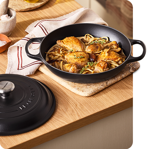 Die manier van koken voelt bijna vanzelfsprekend aan. Je begint op het fornuis, bouwt smaak op door te bakken en te roeren, en schuift de pan daarna moeiteloos de oven in om het gerecht verder te laten garen. En wanneer alles klaar is, hoeft er niets meer overgeschept te worden. De campagnard gaat rechtstreeks naar tafel, waar hij nog lang warmte vasthoudt en tegelijk een echte blikvanger vormt.