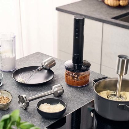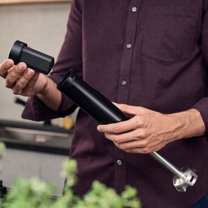De XTEND-collectie bestaat uit drie draadloze toestellen die perfect op elkaar afgestemd zijn: een staafmixer, een handmixer en een kruimeldief. Elk toestel werkt met dezelfde verwisselbare batterij, waardoor je moeiteloos wisselt tussen mixen, kloppen en opruimen — zonder telkens een nieuw toestel aan te sluiten.