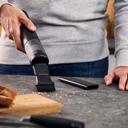 Na het koken volgt het opruimen — en ook dat kan eenvoudiger. De draadloze kruimeldief is compact, krachtig en altijd binnen handbereik. Perfect om kruimels, bloem of kleine morsmomenten snel weg te werken, zonder de grote stofzuiger boven te halen.
