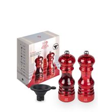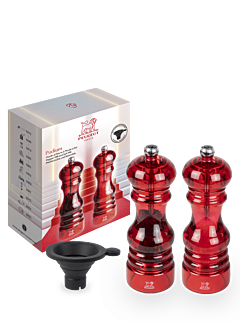 Deze uitvoering is speels, modern en opvallend. Het transparante acryl toont de inhoud van de molens, terwijl het rode accent zorgt voor kleur en dynamiek op tafel. Ideaal voor wie houdt van een frisse, hedendaagse uitstraling en graag een statement maakt tijdens het tafelen. -