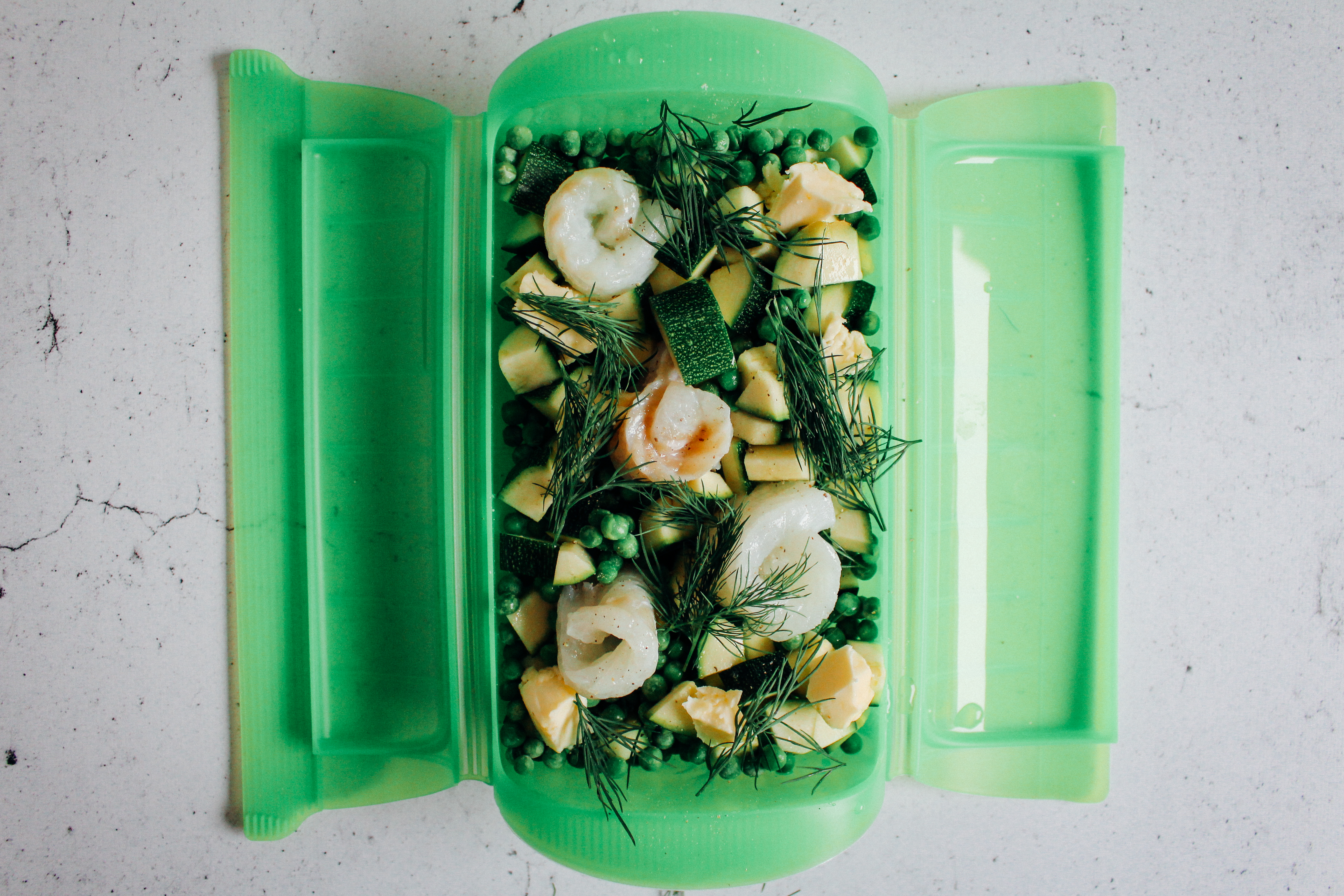 We besluiten een gerechtje van Lékué zelf uit te proberen: gestoomde tongrolletjes met erwten, courgette en citroen. De voorbereiding neemt niet meer dan enkele minuten in beslag: we wassen en snijden de courgette, rollen de tongfilets op en leggen alles samen zorgvuldig op de vochtafscheider. Nog wat boter toevoegen, een kneepje citroen en wat extra dille voor de smaak, en de stomer kan in de microgolf.
