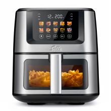 Het intuïtieve aanraakscherm geeft toegang tot tien programma’s: frituren met hete lucht, grillen, kip, kippenvleugels, pizza, drogen, braden, groenten, bakken en ontdooien.